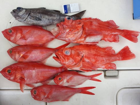 右側の上2匹がアコウダイ(^ω^)2キロはありそうですね。