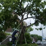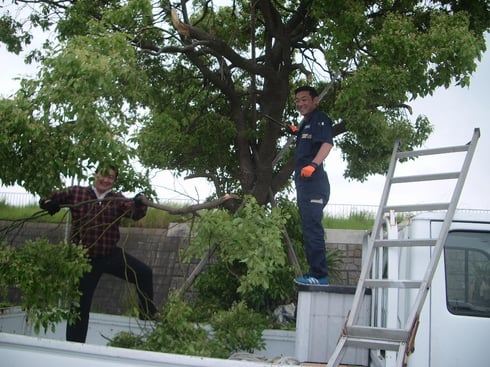 トラックの荷台に乗って更にハシゴを使って頑張っております。
