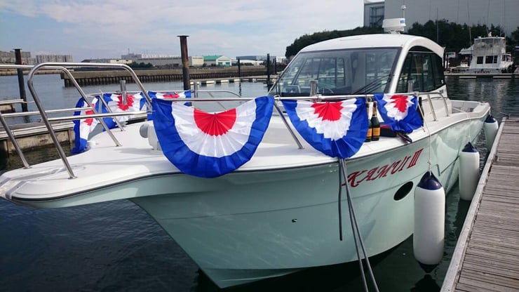 abi「申し訳ございません。マリーナで行う進水式セット(シャンパン・グラス・垂れ幕)忘れまして。。。」