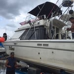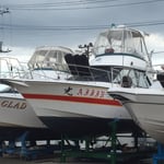 マリーナのお客様はオーダーしたTシャツを着たり釣りや船に関係する持ち物が